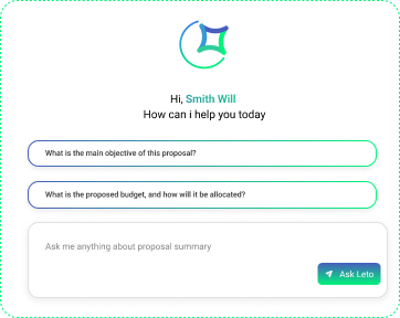 Leto makes attachments fully interactive by extracting key data points and enabling quick answers to queries within documents. Simply ask questions in everyday language, and Leto retrieves relevant information from proposals, contracts, or reports. This conversational interface eliminates the need for tedious manual searches, making research administration more efficient and user-friendly for everyone involved.